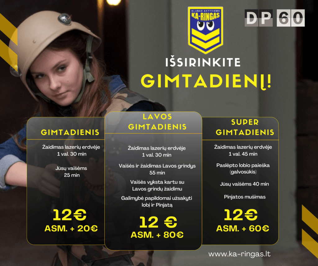 Mega gimtadienio pradžia vyksta pabėgimų kambariuose DP60 Vytauto pl. 29, ištrūkę į laisvę keliaujame į lazerių erdvę KA-Ringas Kaunakiemio g. 5.
